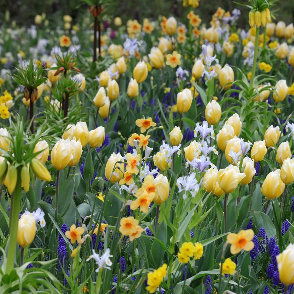 Une collection qui met en scène de façon brillante le contraste et l’harmonie en jouant avec la complémentarité des couleurs et des formes de fleurs. Sans oublier le parfum. La tulipe et le narcisses, tous deux dans des tons de jaune, percutent le bleu violacé vif des muscaris, tandis que la fleur de porcelaine de l’iris, d’un blanc lavé de mauve et rehaussée d’or, harmonise l’ensemble. Tous ces bulbes qui fleurissent de concert créent un tableau à la fois joyeux et plein de fraîcheur qui annonce en fanfare le retour du printemps. Ajoutez de la hauteur et du style à votre massif en intercalant des !