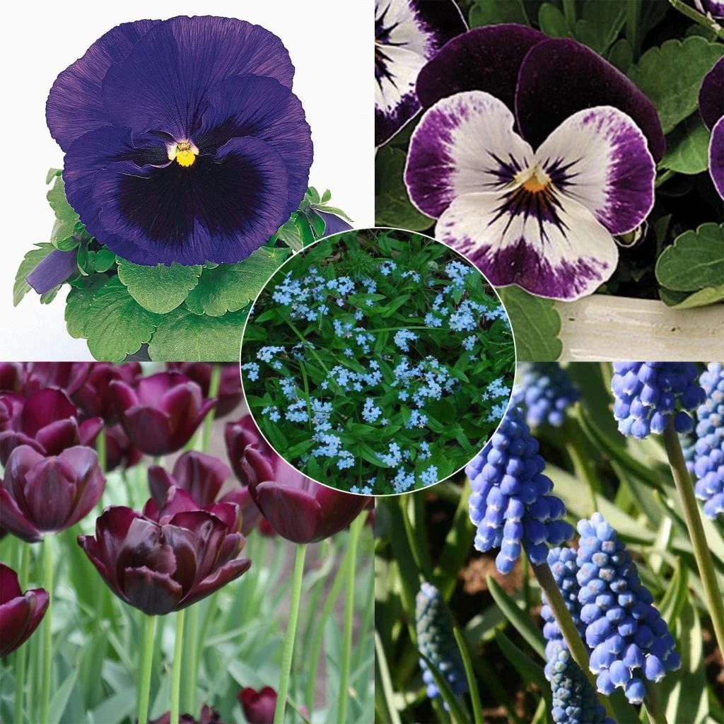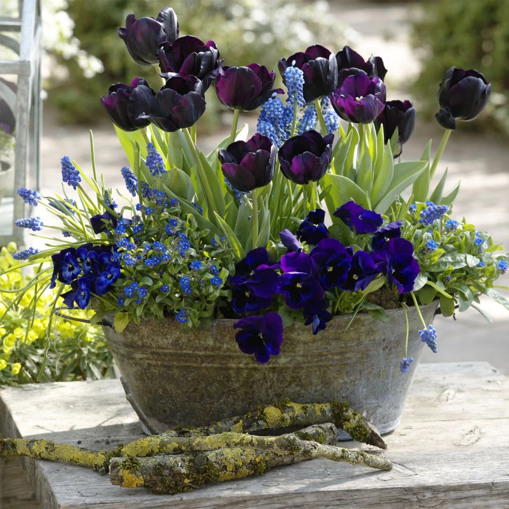 Collection de 5 plants de bisannuelles en mini-mottes, 5 bulbes de tulipes triomphe ‘Black Jack’ et 20 muscaris ‘Blue Magic’ pour une jardinière fleurie au printemps dans des tons allant du bleu pur au violet presque noir comme la nuit. Les bulbes et les myosotis et pensées bisannuelles se mettent mutuellement en valeur pour un spectacle envoutant de février à mai sur les rebords de fenêtre et les terrasses.