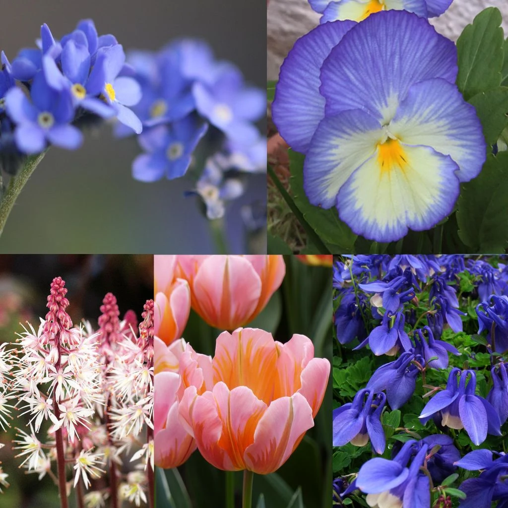 Collection de 5 plants de bisannuelles en mini-mottes, 10 bulbes de tulipes triomphe ‘Pretty Princess’ et 1 ancolie naine en godet pour une jardinière fleurie au printemps dans des couleurs pastel très douces.