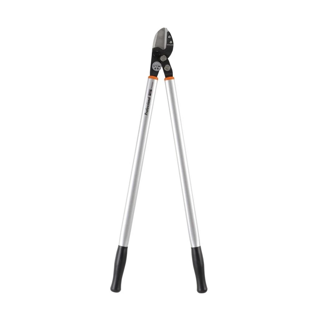 Le coupe-branche à enclume rassemble le même type de tête que les sécateurs à enclumes en plus grand et s’équipent de manches plus longs permettant d’atteindre les branches en hauteur et moins accessibles. En effet, la lame supérieure est fine et aiguisée et vient buter contre la lame inférieure constituée d’une plaque en métal. Cette « enclume » permet de mieux tenir la branche à couper et de répartir la pression exercée. Cet outil est ainsi adapté à la taille de branches et tiges mortes ou matures, très sèches et dures. Évitez les bois plus tendres et vertes car cet outil écraserait leurs tissus.