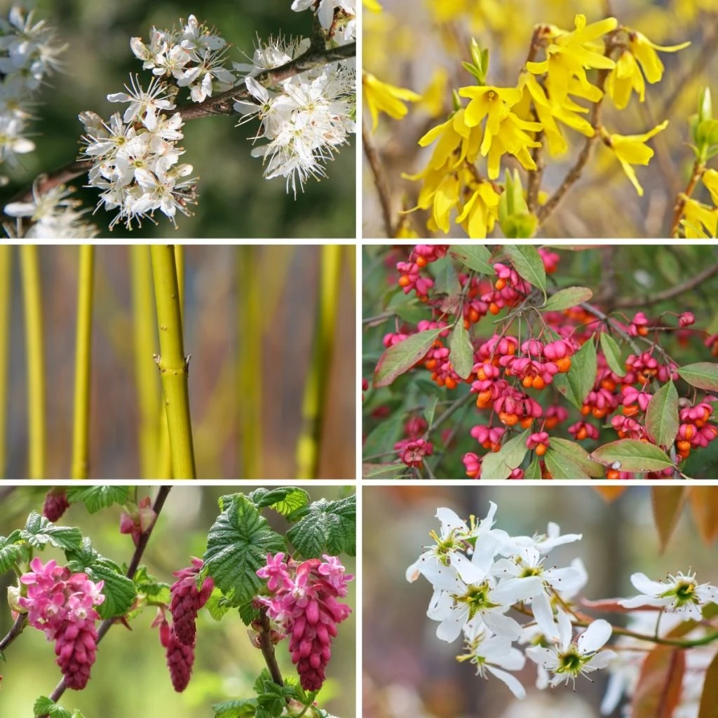 1 x Forsythia (Forsythia intermedia), hauteur adulte : 2 à 3 m. Arbuste très florifère, il se couvre de fleurs d’un jaune éclatant au début du printemps, dès le retour de la belle saison. Sa floraison attire les pollinisateurs.