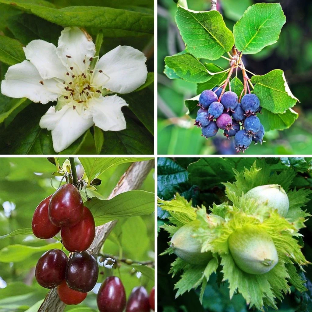 – 1 Néflier d’Allemagne (Mespilus germanica) : arbuste caduc de croissance moyenne au port large atteignant 3 m de hauteur pour 4 m de large. Ses branches présentent parfois quelques grandes épines dispersées, ses grandes feuilles vert foncé virent à l’orange à l’automne. Il fleurit fin mai. Les fruits appelés nèfles mesurent 3 cm de diamètre, leur peau d’un brun orangé cache une chair crémeuse, douce et sucrée une fois blette. On les récolte après les premières gelées, à partir d’octobre selon les régions.