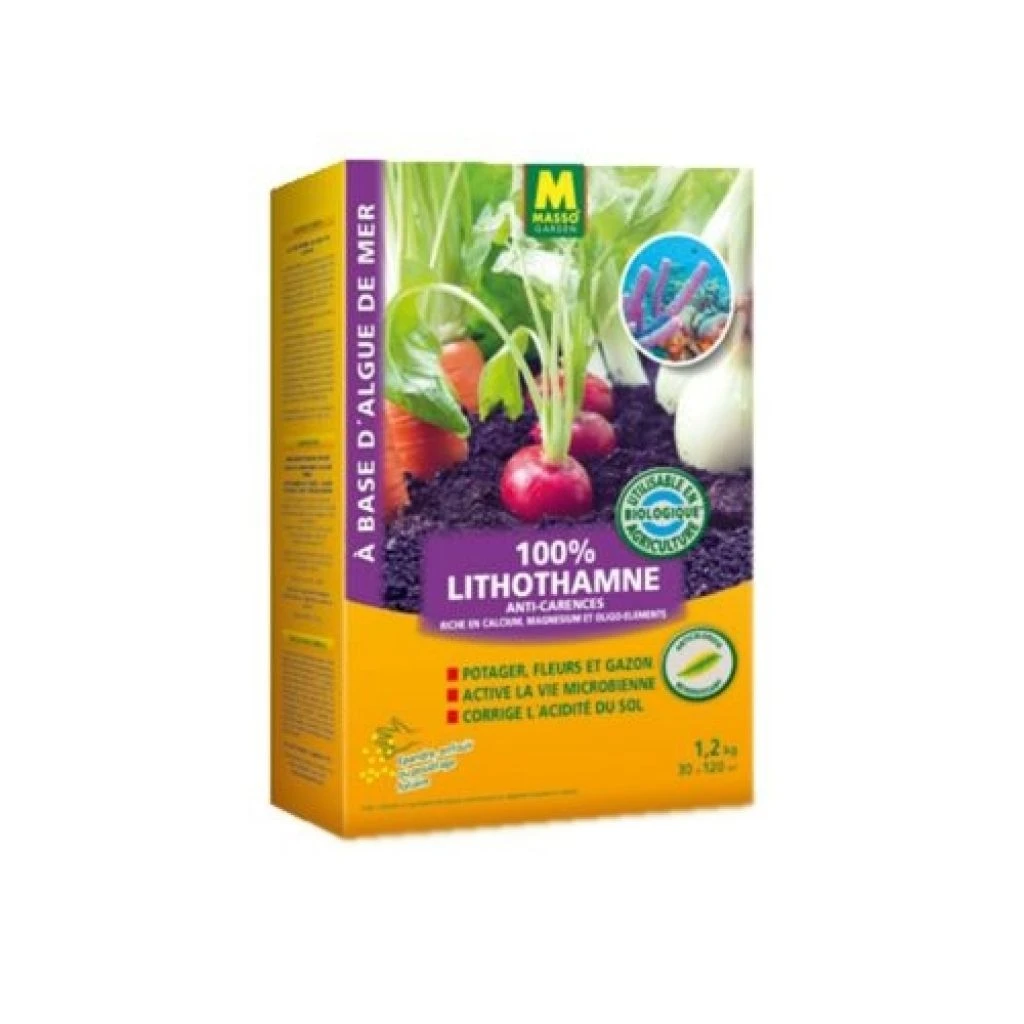 Le Lithothamne « Maërl » algue de mer UAB Masso Garden est à la fois un correcteur d’acidité et un amendement destiné à corriger les défauts des terres très acides, peu favorables à de nombreuses cultures potagères ou florales. C’est un produit 100 % naturel à base d’algues marines calcaires et séchées. On l’utilise pour corriger les carences en calcium, magnésium et oligo-éléments, pour réactiver la vie microbienne du sol et pour faire remonter le pH. Adapté à toutes les plantes, en dehors des plantes acidophiles et de terre de bruyère, cet amendement est aussi connu pour limiter la prolifération des mousses dans le gazon. Il est utilisable en agriculture biologique. Facile à épandre, le lithothamne se diffuse dans le sol à la faveur des arrosages et des pluies.
