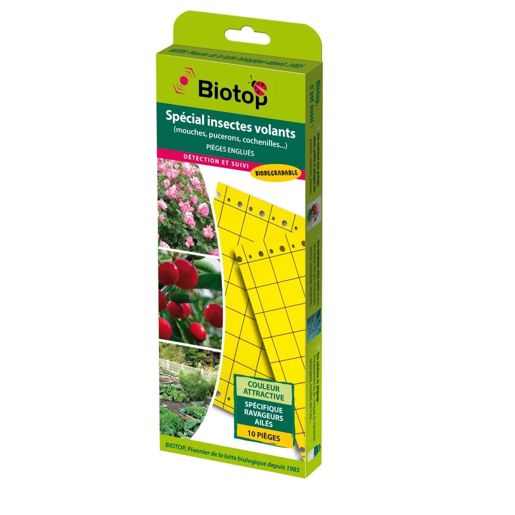 Ces plaques engluées jaunes de Biotop constituent une solution efficace et écologique pour lutter contre de nombreux insectes volants nuisibles tels que les mouches, aleurodes, mineuses, noctuelles, pucerons, cochenilles… Le quadrillage dessiné sur les plaques permet d’identifier, de compter et de suivre les populations présentes dans les cultures, ainsi que de contrôler l’efficacité du dispositif.