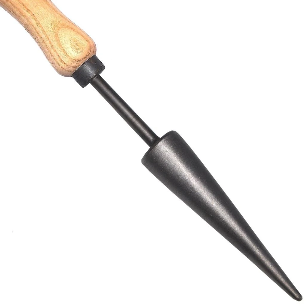 Le plantoir conique est un outil à main indispensable lorsque l’on doit préparer les trous de plantation dans les jardinières, bacs à fleurs, massifs de plantes densément plantés ou encore dans les carrés potagers surélevés. Il est conçu pour creuser et excaver, dans une terre bien préparée, assouplie et affinée au préalable. Ce modèle se compose d’un court manche en frêne naturel, réputé pour sa dureté, avec une emmanchure métallique en douille où vient se fixer la tête forgée à la main dans un acier carbone trempé, résistant à la fois aux chocs, à la torsion et à la corrosion grâce à la finition en acier au bore. Ce plantoir sert à réaliser des trous de 10cm de profondeur pour 3.5 cm de diamètre au maximum, ce qui convient aux bulbes de petit calibre. On l’emploie aussi pour creuser des sillons étroits dans lesquels seront déposés des graines, avant rebouchage avec la terre. Le manche est compostable, la tête métallique est recyclable.