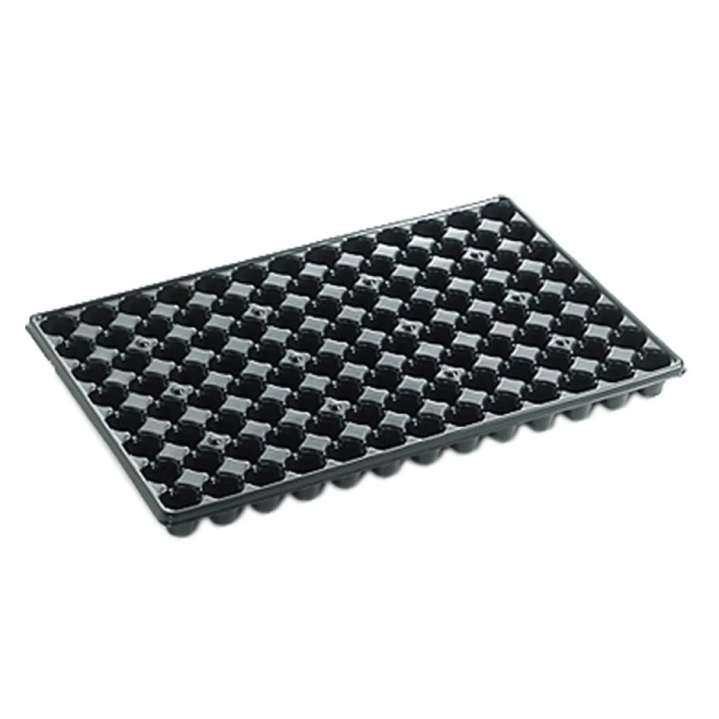 La plaque de culture mesure 50 cm de long pour 33 cm de large et 4 cm de haut. Elle est fabriquée en matière plastique de couleur noire, mate, suffisamment rigide pour pouvoir être facilement manipulée. Elle présente 104 cellules de culture à base carrée mesurant 4 cm de hauteur pour 3.2 cm de côté (soit un volume de 23 cm cube par cellule), d’un seul tenant. Ce qui facilite le remplissage des alvéoles avec du terreau, la mise en place, les semis, les manipulations, les soins, l’arrosage et le repiquage. L’arrosage pourra se faire à l’aide d’un arrosoir muni d’une pomme fine, ou par capillarité, en plaçant par exemple un morceau de moquette que vous pourrez humidifier, sous la plaque de semis. Le plant sera ainsi protégé contre un arrosage trop agressif et bénéficiera en revanche d’un apport régulier en eau avec un substrat qui sera toujours humide.