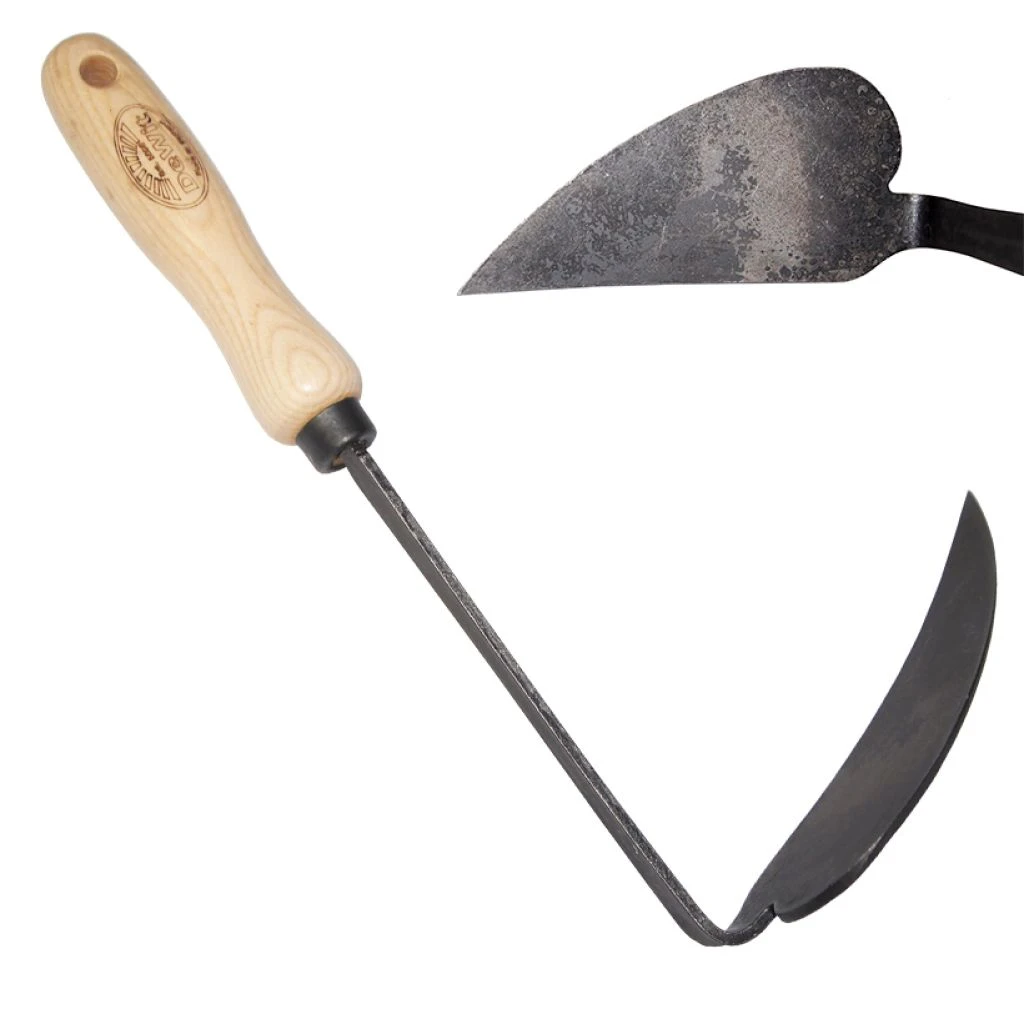 La houe coréenne est un outil encore peu connu des jardiniers occidentaux. Outil traditionnel utilisé depuis fort longtemps en Corée pour le travail du sol et le désherbage des cultures, il se caractérise par une lame de forme particulière, incurvée. On l’utilise comme une houe, en tirant la lame vers soi, en fendant le sol pour ameublir le sol, le racler, pour déloger les adventices, butter une culture, ou pour ramener la terre au-dessus d’un semis. À la fois pioche et binette, sa tête se faufile partout autour des plantes, dans les massifs, au potager ou dans les bacs à fleurs. Sa lame pointue permet d’émietter et d’alléger la couche superficielle du sol après bêchage, de sectionner et déraciner les plantes indésirables les plus résistantes, ou encore de creuser des trous et sillons de plantation peu profonds, sans grand effort. On peut aussi l’employer pour désherber facilement sous un paillis.