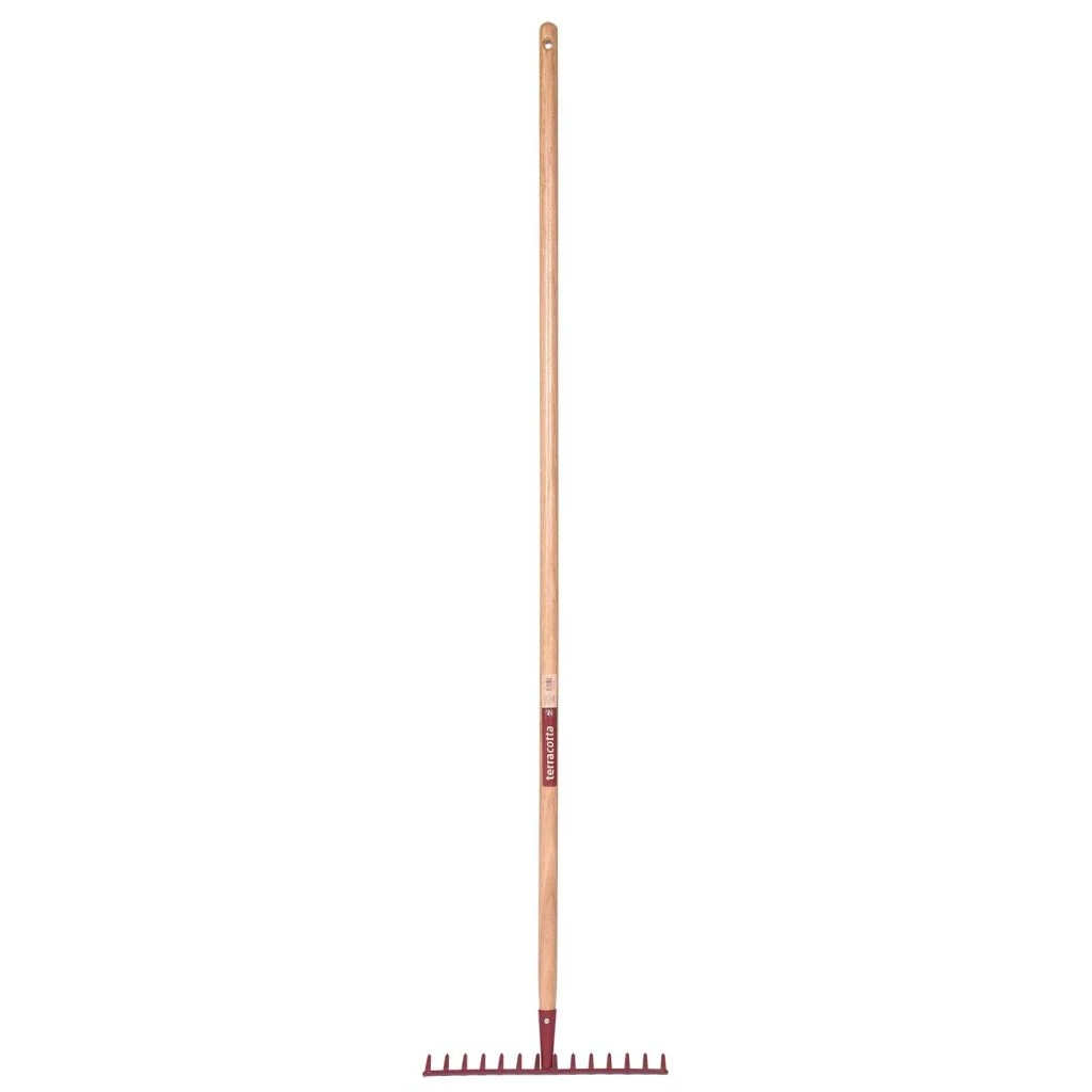 Le râteau forgé 14 dents courbes terracotta manche bois pomme Leborgne est un outil de très bon rapport qualité/prix, spécialement conçu pour les petits travaux de jardinage en surface du sol! Sa tête composé d’acier est munie de 14 dents courbes, idéales pour le ramassage des déchets végétaux mais aussi pour former des buttes autour des plantations ou répartir les matériaux comme le gravier, le sable ou le terreau. Son manche pomme en bois d’eucalyptus, long de 150 cm évite à l’utilisateur de trop se pencher, rendant le travail moins pénible. C’est également un outil essentiel pour finir la préparation des sols avant leur mise en culture car il permet de briser les mottes après le béchage puis d’affiner et de niveler la terre en surface. De plus, il est doté d’une douille soudée très robuste qui permet un rechange facile du manche. Manche vendu en pièce de rechange. Fabrication française. Garantie 8 ans.