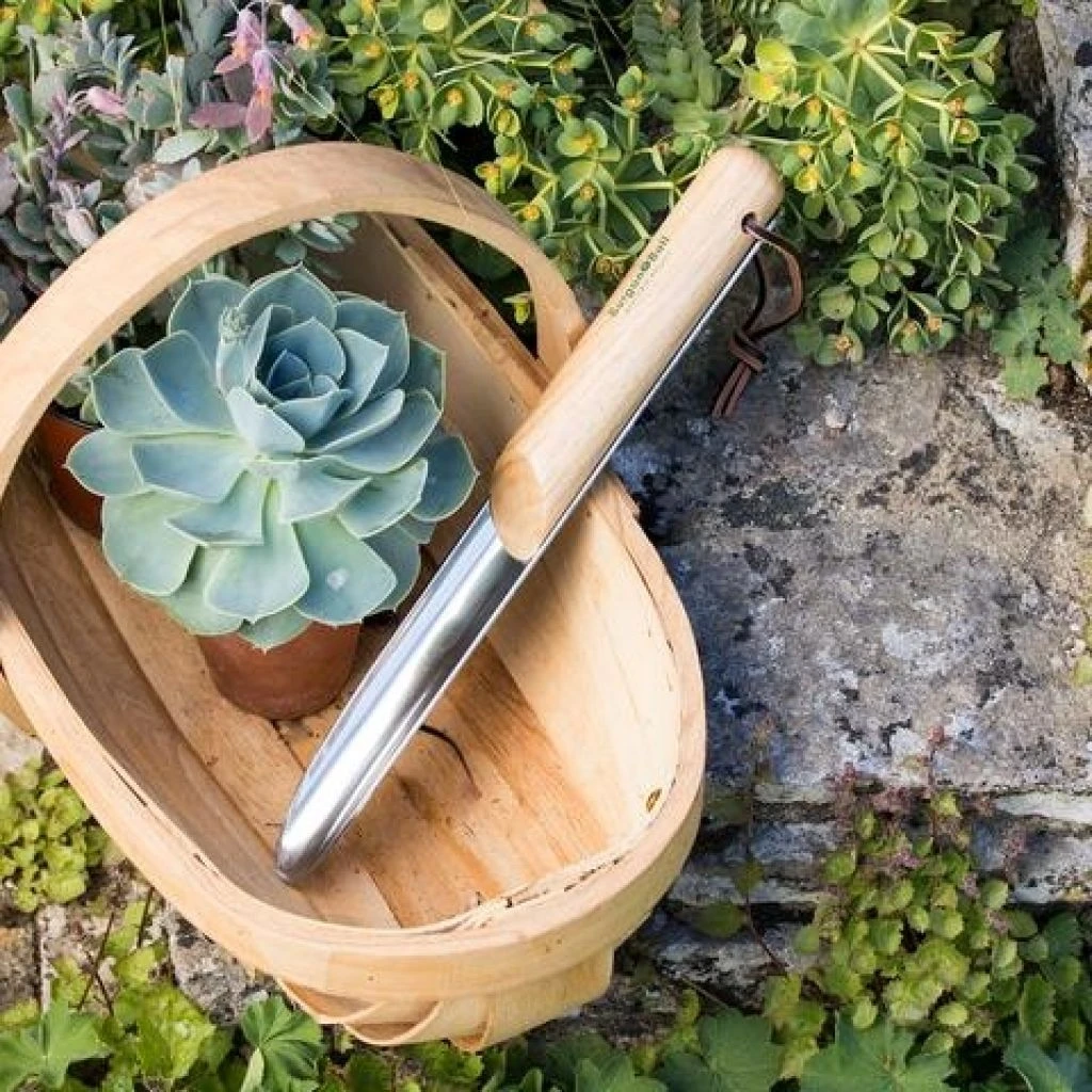 Ce transplantoir à poignée en acier inoxydable poli de Burgon & Ball est un très bel outil de jardin maniable, très pratique pour creuser des trous de plantation pour y déposer des petits bulbes, et même repiquer des plantes en godet dans les terres rocailleuses. Cet outil pour travailler dans les rocailles, grâce à la finesse de sa lame qui se faufile entre les pierres a été développé à l’origine par des jardiniers victoriens pionniers. Equipé d’un petit manche en bois certifié FSC*, il assure une bonne prise en main. Sa tête métallique, étroite et qui s’étend sur toute la longueur de l’outil pour une résistance optimale, est en acier inoxydable poli.