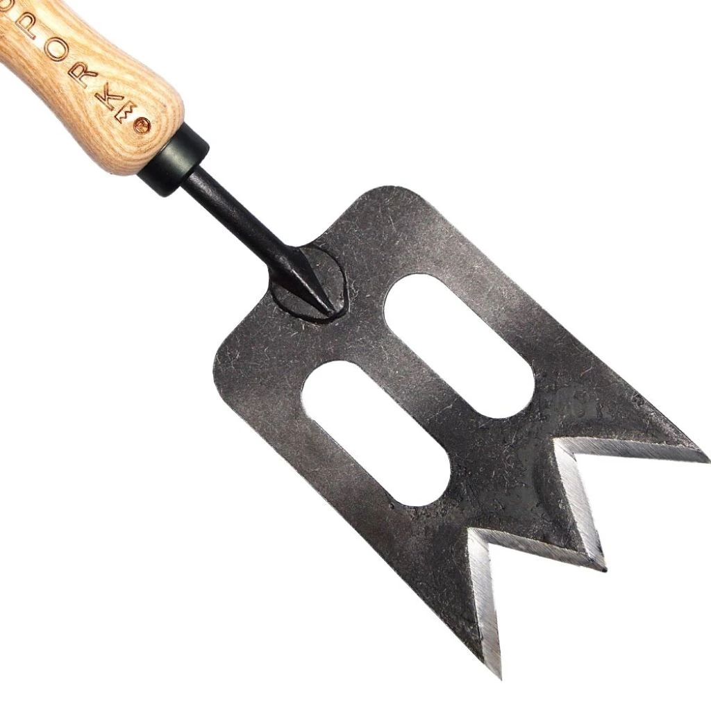 Le transplantoir forme spork est un outil à main polyvalent qui permet à la fois de désherber, transplanter, décompacter la terre en surface et creuser des trous de plantation.