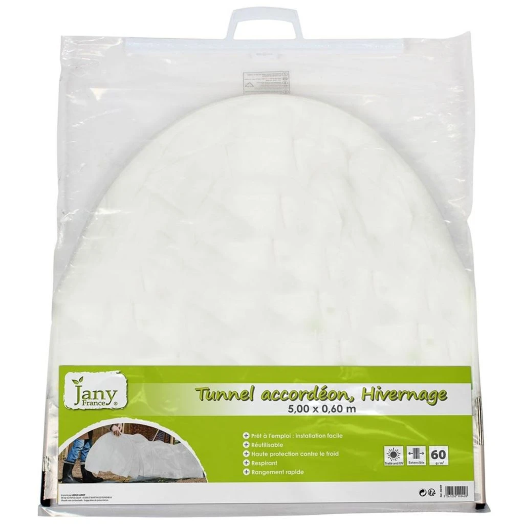 Cette serre tunnel en accordéon, pré-montée, est très simple à mettre en place et à manipuler. Elle protège contre le froid grâce à son voile de 60g/m2 tout en laissant respirer les plantes. Ce dispositif permet d’avancer ou de prolonger les récoltes de 2 à 4 semaines selon les régions. Il est composé du voile, avec arceaux en acier intégrés. Le système d’accordéon permet d’adapter sa longueur en fonction de la taille du jardin et de le replier complètement pour le ranger.
